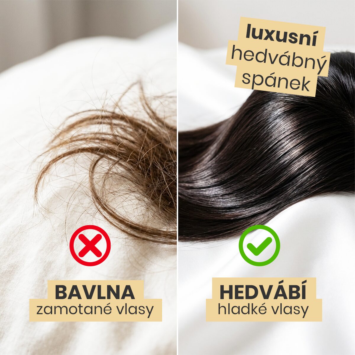 Rozhodně ano. Hedvábí snižuje tření mezi vlasy a polštářem až o 40 % ve srovnání s bavlnou. Vlasy se méně lámou, nevysušují a zůstávají hladké a lesklé. Ideální doplněk pro barvené, kudrnaté nebo suché vlasy. Hedvábný povrch navíc prodlužuje efekt fénování a stylingu.