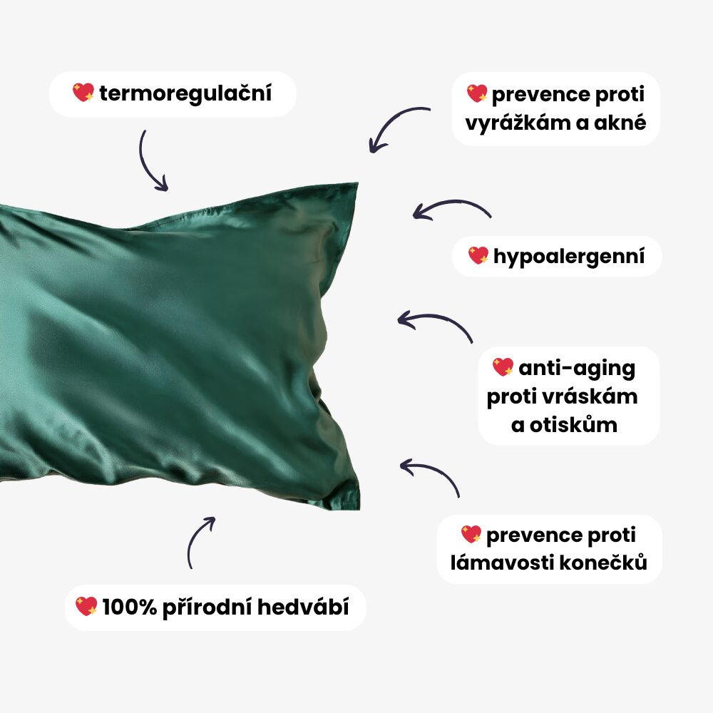- Hedvábí – hladký povrch minimalizuje tření, snižuje tvorbu vrásek a lámání vlasů.